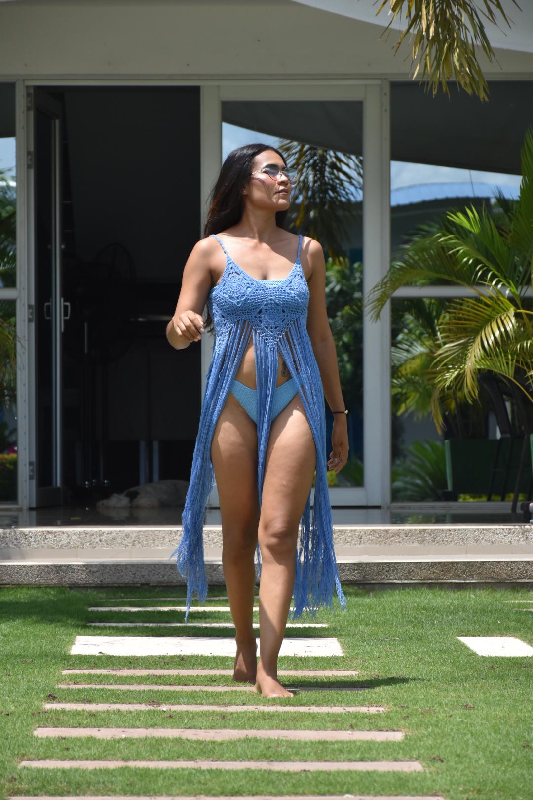 Diseño en forma de vestido con cuerpo tejido a crochet estilo bohemio, con detalles calados y tirantes delgados