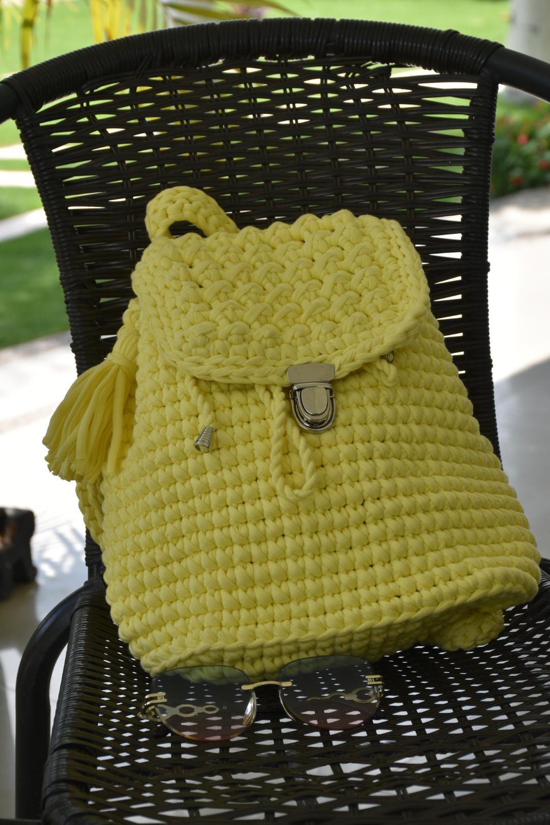 Mochila tejida a mano con trapillo pluma, color amarillo,- bolso artesanal de moda para mujer. combinando funcionalidad y tendencia, ideal como bolso para salidas informales, cuanta con cordón ajustable asa superior y tirantes traseros cómodos y resistentes.