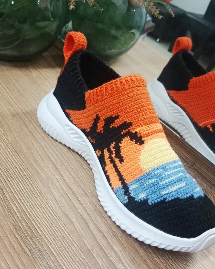 Dejate llevar por la calidez del sol y la brisa del mar con los senset step, tenis tejidos a mano con un diseño unico de paisaje tropical al atardecer. su tejido comodo , y ligero y colorido los convierte en el aliado perfecto para quines buscan estilo, frescura y originalidad. con un suela argonomica del alta calidad y amigable brindando confort todo el dia.