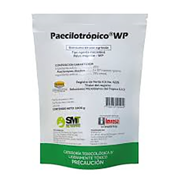 PAECILOTROPICO WP 500 GRAMOS: El Paecilotrópico WP 500 gramos es un bioinsecticida y nematicida diseñado para el control de plagas en cultivos agrícolas. Ingrediente activo: Hongo Paecilomyces lilacinus (1x10⁹ esporas viables por gramo). Formulación: Polvo mojable (WP). Modo de acción: Las esporas germinan al contacto con el agua, penetran la cutícula de los insectos plaga y liberan toxinas que causan su muerte en un periodo de 4 a 7 días. Usos principales: Control preventivo de plagas y nematodos en cultivos como melón, palma de aceite y tomate.
